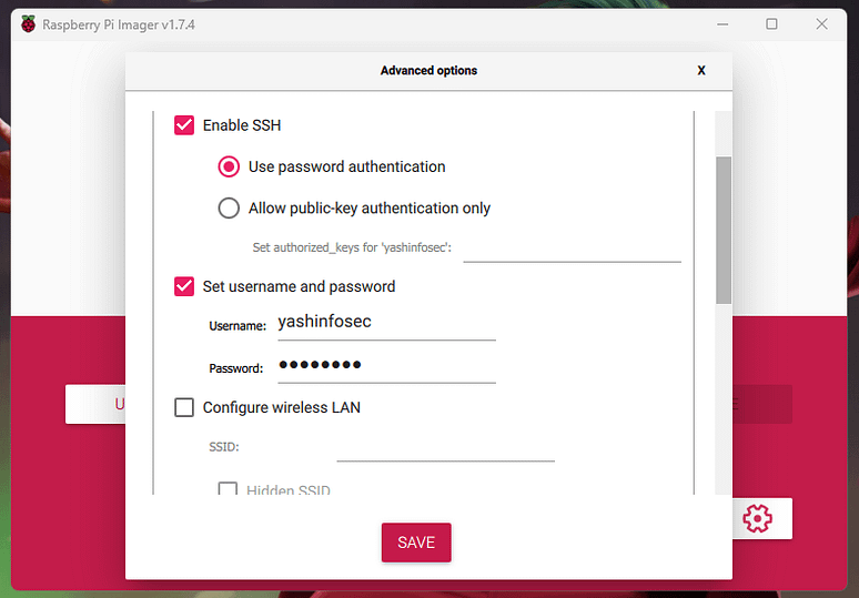choose SD card as storage and open settings > check enable SSH, and set Username and Password > write