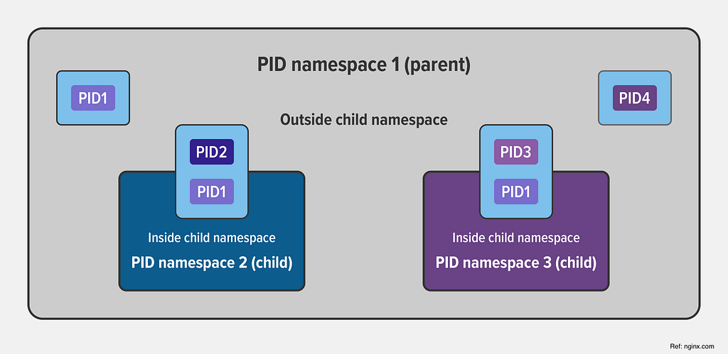 - PID namespace: Processes in one namespace are not aware of processes in another namespace