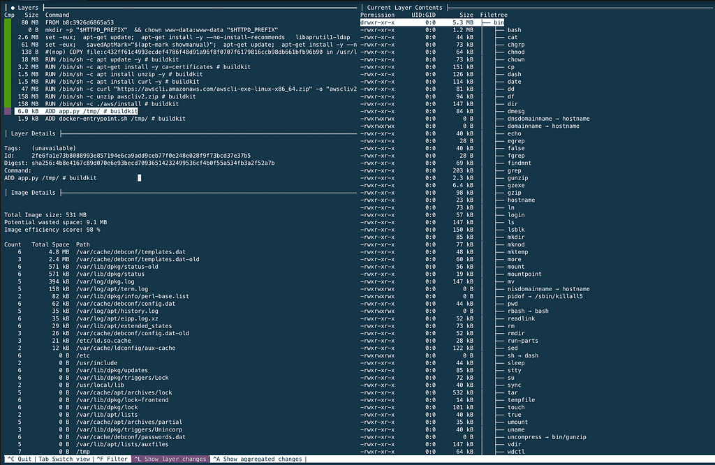 Commands mkdir 3.3.2_dive cd 3.3.2_dive wget https://github.com/wagoodman/dive/releases/download/v0.9.2/dive_0.9.2_linux_amd64.deb